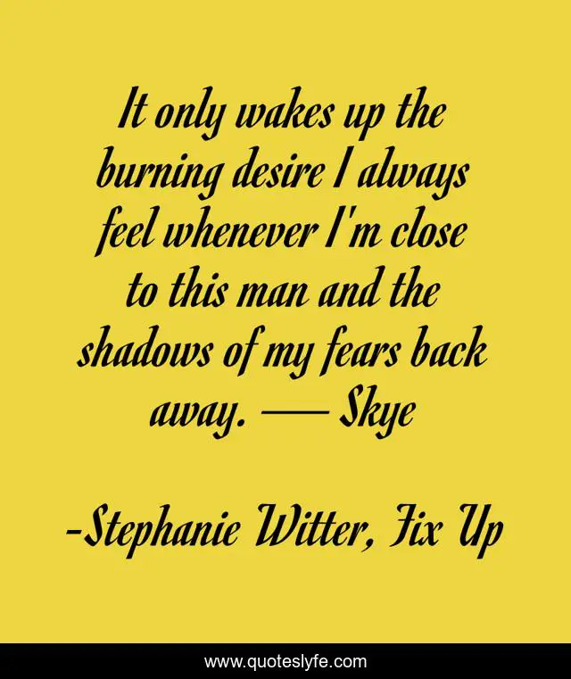 This page presents the quote "It only wakes up the burning desire I always feel whenever I'm close to this man and the shadows of my fears back away. — Skye". Author of this quote is Stephanie Witter, Fix Up. This quote is about duke, contemporary-romance, patch-up-series, skye, contemporary, drama, fix-up, college, romance,.