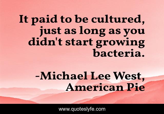 This page presents the quote "It paid to be cultured, just as long as you didn't start growing bacteria.". Author of this quote is Michael Lee West, American Pie. This quote is about humorous, being-cultured,.