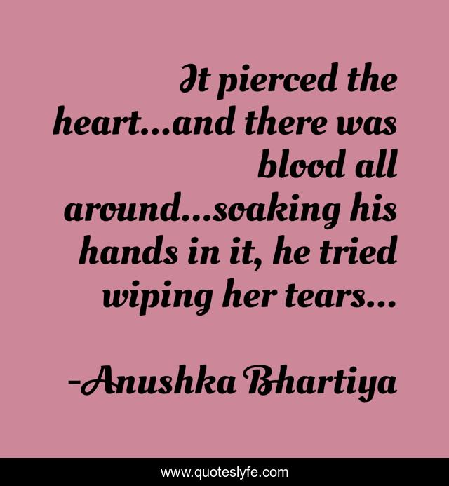 This page presents the quote "It pierced the heart...and there was blood all around...soaking his hands in it, he tried wiping her tears...". Author of this quote is Anushka Bhartiya. This quote is about heart, tears,.