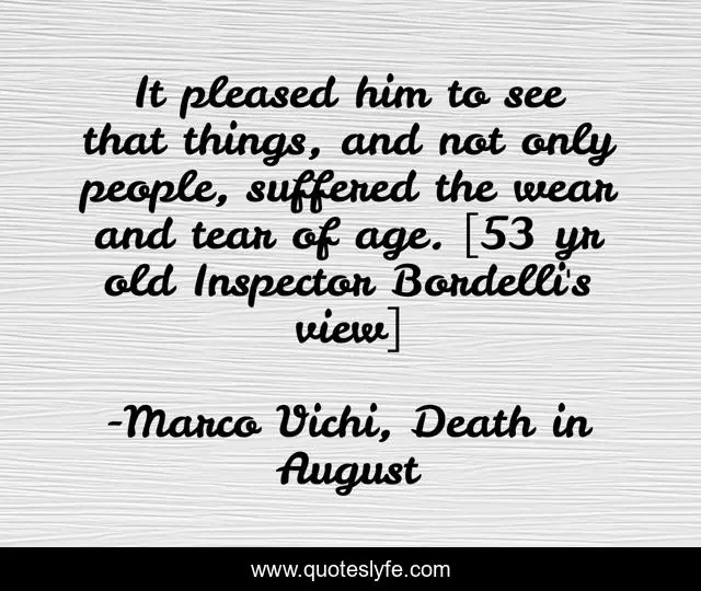 This page presents the quote "It pleased him to see that things, and not only people, suffered the wear and tear of age. [53 yr old Inspector Bordelli's view]". Author of this quote is Marco Vichi, Death in August. This quote is about aging, italian,.