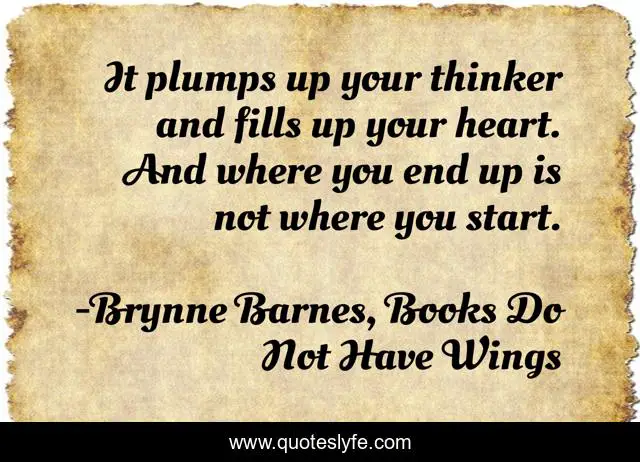 This page presents the quote "It plumps up your thinker and fills up your heart. And where you end up is not where you start.". Author of this quote is Brynne Barnes, Books Do Not Have Wings. This quote is about reading-books, books, reading,.