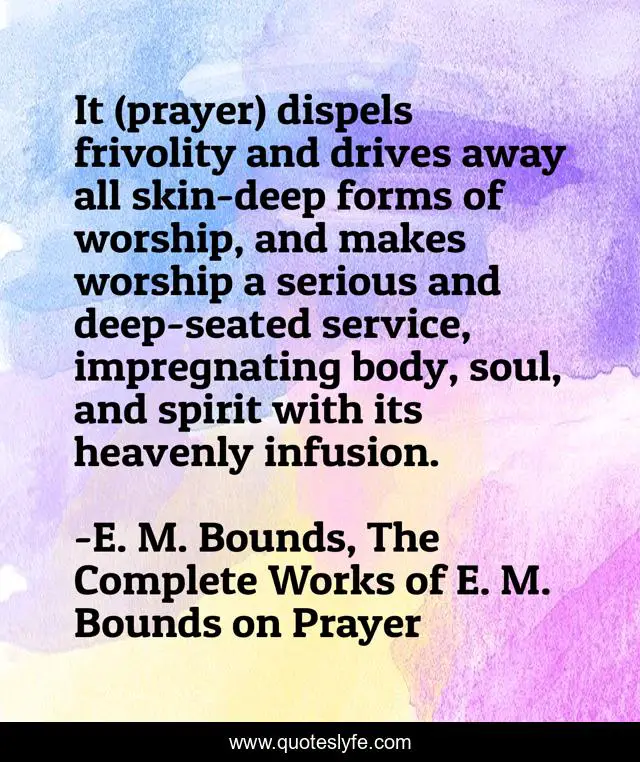 This page presents the quote "It (prayer) dispels frivolity and drives away all skin-deep forms of worship, and makes worship a serious and deep-seated service, impregnating body, soul, and spirit with its heavenly infusion.". Author of this quote is E. M. Bounds, The Complete Works of E. M. Bounds on Prayer. This quote is about devotion, prayer,.