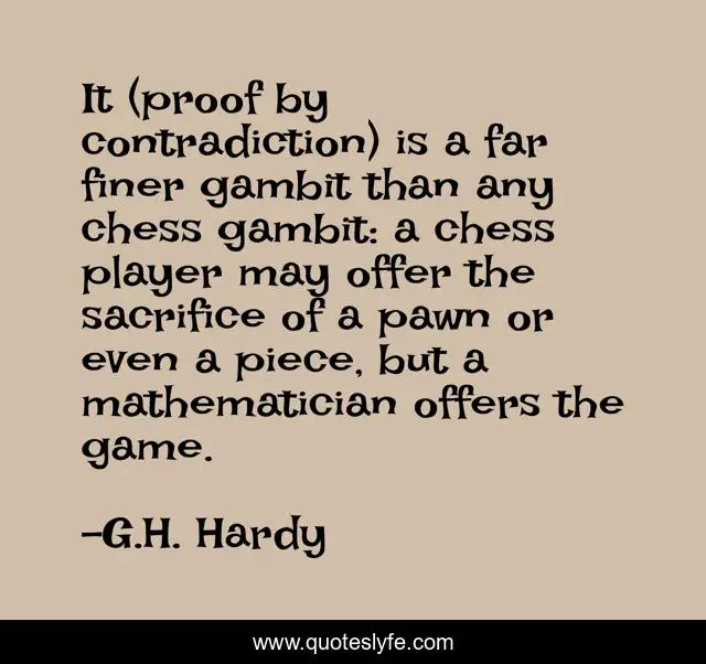 This page presents the quote "It (proof by contradiction) is a far finer gambit than any chess gambit: a chess player may offer the sacrifice of a pawn or even a piece, but a mathematician offers the game.". Author of this quote is G.H. Hardy. .