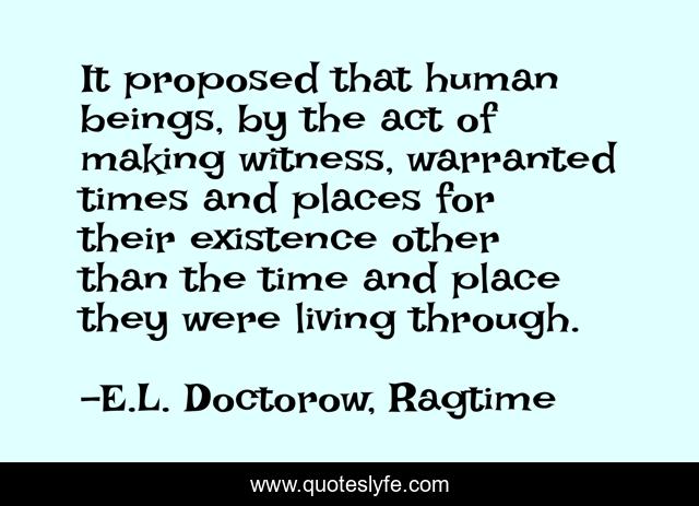 This page presents the quote "It proposed that human beings, by the act of making witness, warranted times and places for their existence other than the time and place they were living through.". Author of this quote is E.L. Doctorow, Ragtime. This quote is about existence, human,.