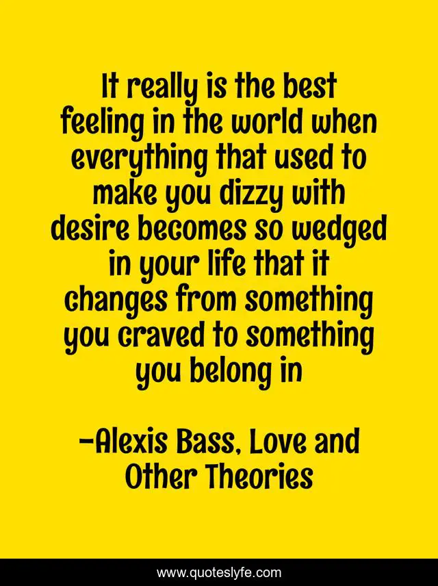 This page presents the quote "It really is the best feeling in the world when everything that used to make you dizzy with desire becomes so wedged in your life that it changes from something you craved to something you belong in". Author of this quote is Alexis Bass, Love and Other Theories. This quote is about coming-of-age, love, epiphanic-moment, affection,.
