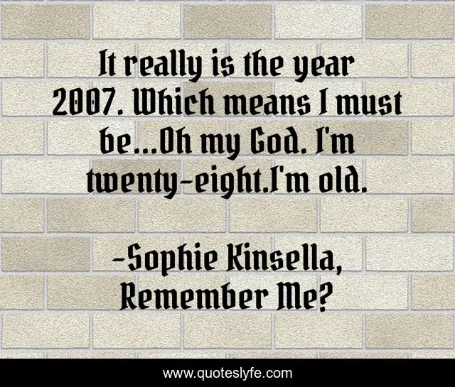 This page presents the quote "It really is the year 2007. Which means I must be...Oh my God. I'm twenty-eight.I'm old.". Author of this quote is Sophie Kinsella, Remember Me?. This quote is about me, sophie, kinsella, remember,.