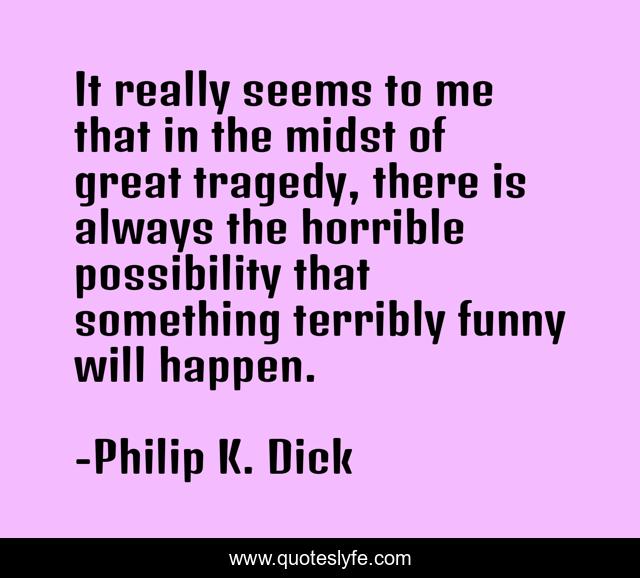 This page presents the quote "It really seems to me that in the midst of great tragedy, there is always the horrible possibility that something terribly funny will happen.". Author of this quote is Philip K. Dick. This quote is about interview, funny, comedy, tragedy,.