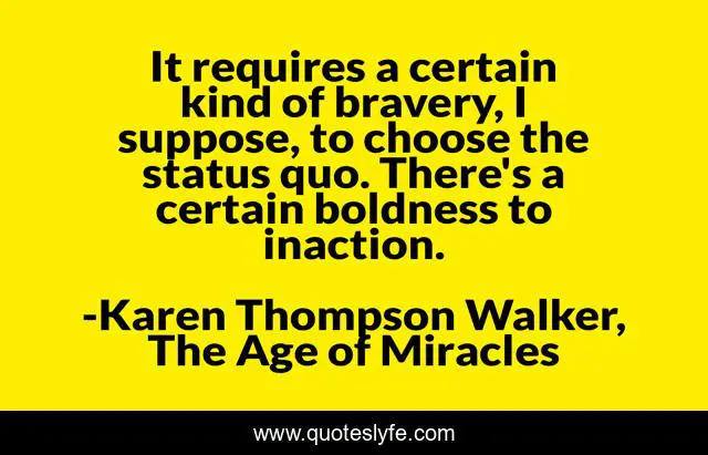 This page presents the quote "It requires a certain kind of bravery, I suppose, to choose the status quo. There's a certain boldness to inaction.". Author of this quote is Karen Thompson Walker, The Age of Miracles. This quote is about action, inaction,.