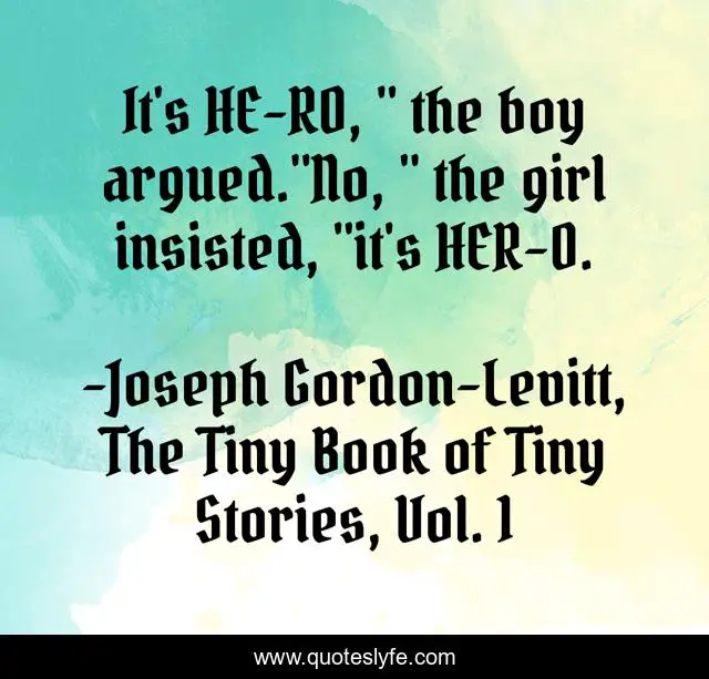 This page presents the quote "It's HE-RO, " the boy argued."No, " the girl insisted, "it's HER-O.". Author of this quote is Joseph Gordon-Levitt, The Tiny Book of Tiny Stories, Vol. 1. This quote is about boy, girl, punny, hero, perspective,.