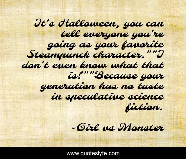 This page presents the quote "It's Halloween, you can tell everyone you're going as your favorite Steampunck character.""I don't even know what that is!""Because your generation has no taste in speculative science fiction.". Author of this quote is Girl vs Monster. This quote is about girl-vs-monster, halloween, science-fiction, scifi, steampunck, disney,.