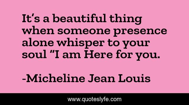 This page presents the quote "It’s a beautiful thing when someone presence alone whisper to your soul “I am Here for you.". Author of this quote is Micheline Jean Louis. This quote is about nature, soulmates, soul, love-human, connections, quotes-to-live-by,.