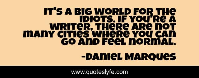 This page presents the quote "It's a big world for the idiots. If you're a writer, there are not many cities where you can go and feel normal.". Author of this quote is Daniel Marques. .