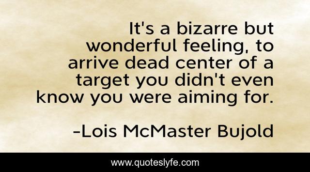 This page presents the quote "It's a bizarre but wonderful feeling, to arrive dead center of a target you didn't even know you were aiming for.". Author of this quote is Lois McMaster Bujold. This quote is about serendipity, writing-process, creativity, writing,.