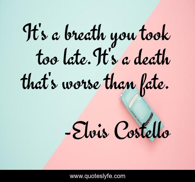 This page presents the quote "It's a breath you took too late.It's a death that's worse than fate.". Author of this quote is Elvis Costello. This quote is about breath, death, lyric, fate, lyrics,.