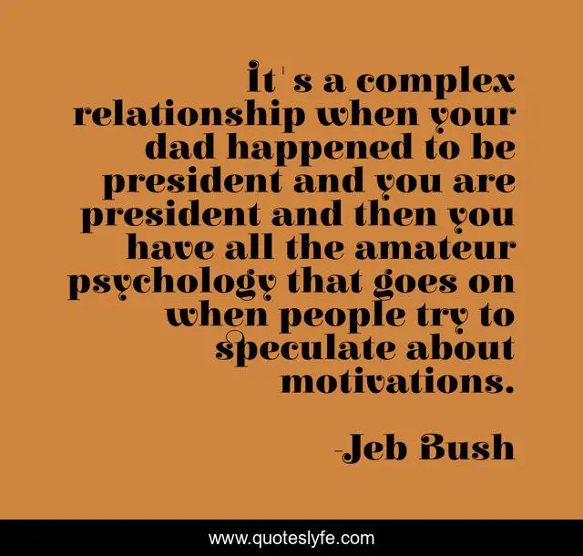 This page presents the quote "It's a complex relationship when your dad happened to be president and you are president and then you have all the amateur psychology that goes on when people try to speculate about motivations.". Author of this quote is Jeb Bush. This quote is about relationship, people,.