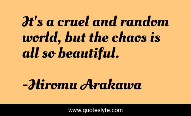 This page presents the quote "It's a cruel and random world, but the chaos is all so beautiful.". Author of this quote is Hiromu Arakawa. This quote is about world, fullmetal-alchemist, chaos,.