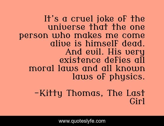 This page presents the quote "It’s a cruel joke of the universe that the one person who makes me come alive is himself dead. And evil. His very existence defies all moral laws and all known laws of physics.". Author of this quote is Kitty Thomas, The Last Girl. This quote is about vampire, evil,.