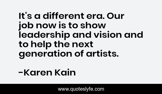 This page presents the quote "It's a different era. Our job now is to show leadership and vision and to help the next generation of artists.". Author of this quote is Karen Kain. This quote is about job, help, vision,.