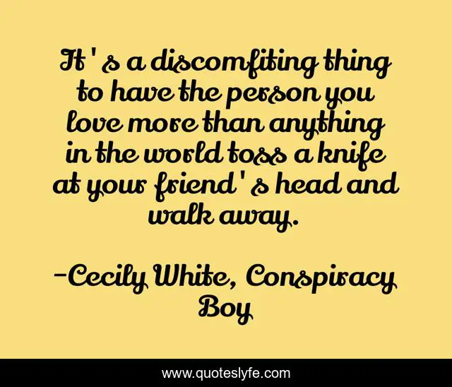 This page presents the quote "It's a discomfiting thing to have the person you love more than anything in the world toss a knife at your friend's head and walk away.". Author of this quote is Cecily White, Conspiracy Boy. This quote is about love, fighting, knife, jackson, friends, amelie, affection,.