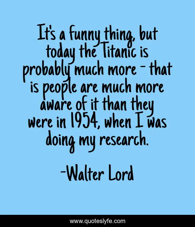 This page presents the quote "It's a funny thing, but today the Titanic is probably much more - that is people are much more aware of it than they were in 1954, when I was doing my research.". Author of this quote is Walter Lord. This quote is about research, today, people,.
