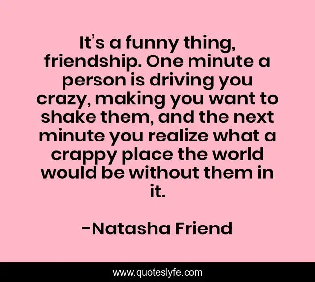This page presents the quote "It’s a funny thing, friendship. One minute a person is driving you crazy, making you want to shake them, and the next minute you realize what a crappy place the world would be without them in it.". Author of this quote is Natasha Friend. .