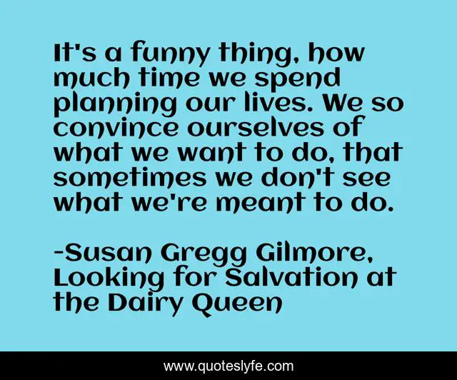 This page presents the quote "It's a funny thing, how much time we spend planning our lives. We so convince ourselves of what we want to do, that sometimes we don't see what we're meant to do.". Author of this quote is Susan Gregg Gilmore, Looking for Salvation at the Dairy Queen. This quote is about life, planning, destiny,.