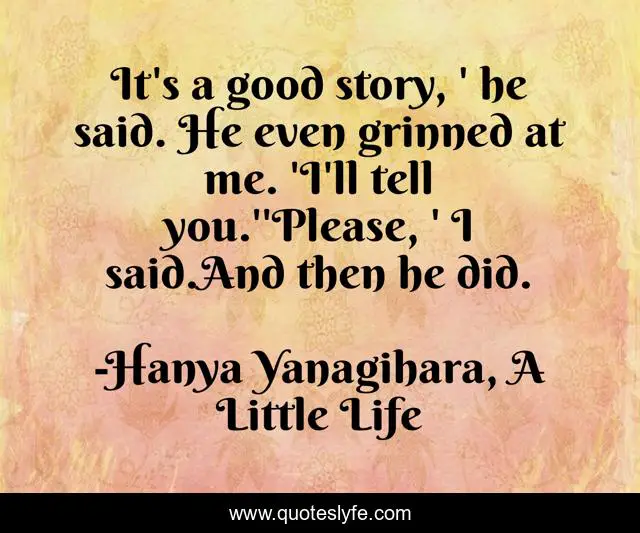 This page presents the quote "It's a good story, ' he said. He even grinned at me. 'I'll tell you.''Please, ' I said.And then he did.". Author of this quote is Hanya Yanagihara, A Little Life. This quote is about bittersweet, story, sad, last-lines, the-end, hanya-yanagihara, ending, a-little-life,.