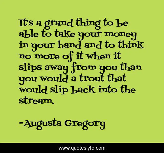 This page presents the quote "It's a grand thing to be able to take your money in your hand and to think no more of it when it slips away from you than you would a trout that would slip back into the stream.". Author of this quote is Augusta Gregory. .