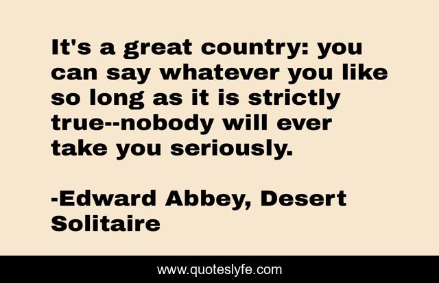 This page presents the quote "It's a great country: you can say whatever you like so long as it is strictly true--nobody will ever take you seriously.". Author of this quote is Edward Abbey, Desert Solitaire. This quote is about free-speech, america,.