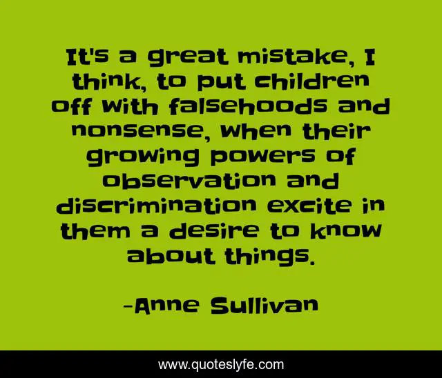 This page presents the quote "It's a great mistake, I think, to put children off with falsehoods and nonsense, when their growing powers of observation and discrimination excite in them a desire to know about things.". Author of this quote is Anne Sullivan. This quote is about great, children, mistake,.