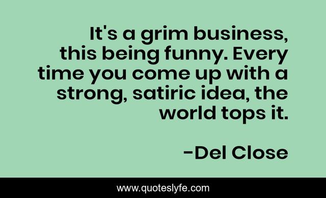 This page presents the quote "It's a grim business, this being funny. Every time you come up with a strong, satiric idea, the world tops it.". Author of this quote is Del Close. This quote is about strong, business, time,.