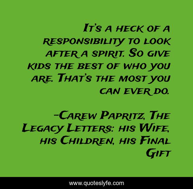 This page presents the quote "It’s a heck of a responsibility to look after a spirit. So give kids the best of who you are. That’s the most you can ever do.". Author of this quote is Carew Papritz, The Legacy Letters: his Wife, his Children, his Final Gift. This quote is about children, parenting, books, parents, the-legacy-letters, carew-papritz, spirit,.