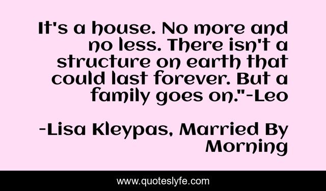 This page presents the quote "It's a house. No more and no less. There isn't a structure on earth that could last forever. But a family goes on."-Leo". Author of this quote is Lisa Kleypas, Married By Morning. This quote is about houses, forever, family,.