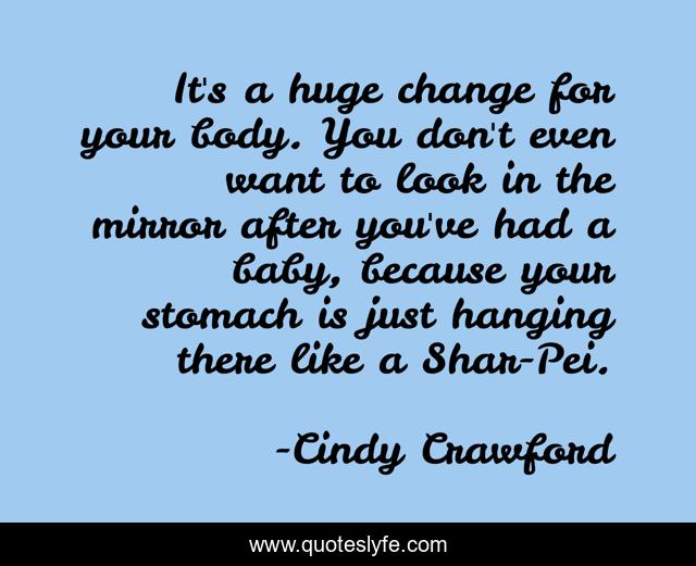 This page presents the quote "It's a huge change for your body. You don't even want to look in the mirror after you've had a baby, because your stomach is just hanging there like a Shar-Pei.". Author of this quote is Cindy Crawford. This quote is about baby, change, mirror,.