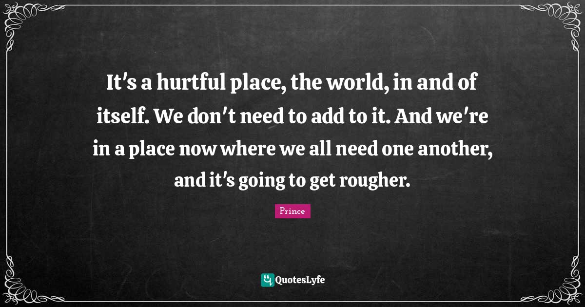 This page presents the quote "It's a hurtful place, the world, in and of itself. We don't need to add to it. And we're in a place now where we all need one another, and it's going to get rougher.". Author of this quote is Prince. This quote is about hurtful, world, add, needs,.