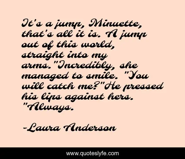 This page presents the quote "It's a jump, Minuette, that's all it is. A jump out of this world, straight into my arms."Incredibly, she managed to smile. "You will catch me?"He pressed his lips against hers. "Always.". Author of this quote is Laura Anderson. .