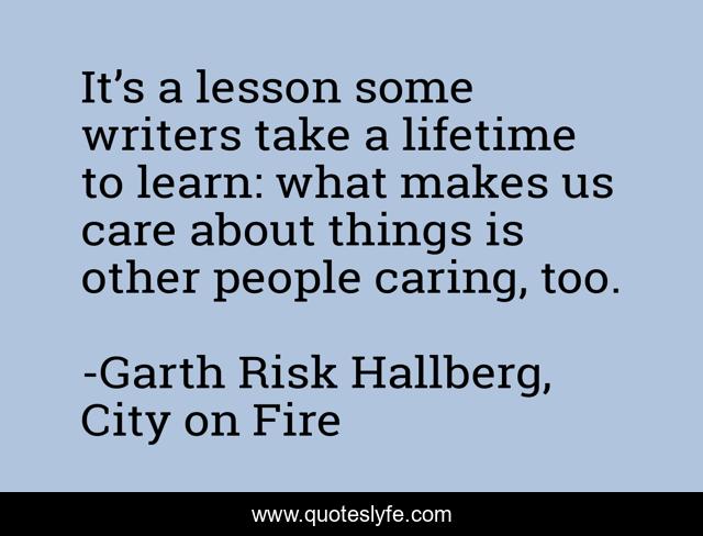 This page presents the quote "It’s a lesson some writers take a lifetime to learn: what makes us care about things is other people caring, too.". Author of this quote is Garth Risk Hallberg, City on Fire. .