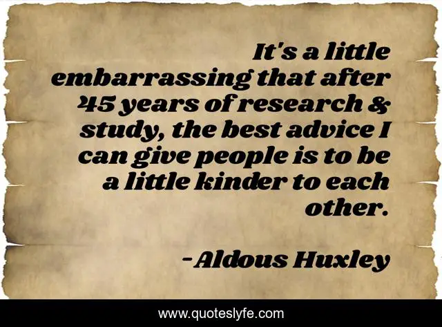 This page presents the quote "It's a little embarrassing that after 45 years of research & study, the best advice I can give people is to be a little kinder to each other.". Author of this quote is Aldous Huxley. This quote is about compassion, kindness,.