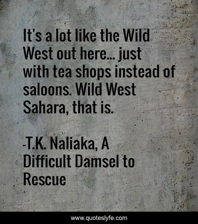 This page presents the quote "It's a lot like the Wild West out here... just with tea shops instead of saloons. Wild West Sahara, that is.". Author of this quote is T.K. Naliaka, A Difficult Damsel to Rescue. This quote is about action-adventure, sahara, wild-west, africa, tea,.