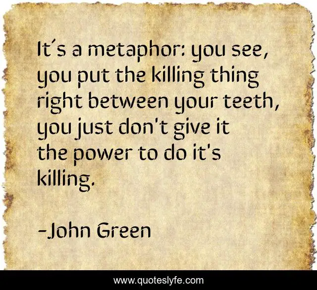 This page presents the quote "It´s a metaphor: you see, you put the killing thing right between your teeth, you just don't give it the power to do it's killing.". Author of this quote is John Green. This quote is about tfios, the-fault-in-our-stars, metaphor,.