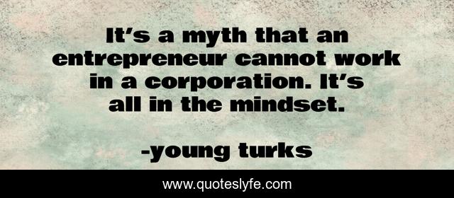 This page presents the quote "It’s a myth that an entrepreneur cannot work in a corporation. It’s all in the mindset.". Author of this quote is young turks. This quote is about entrepreneur, startups, corporate-culture,.