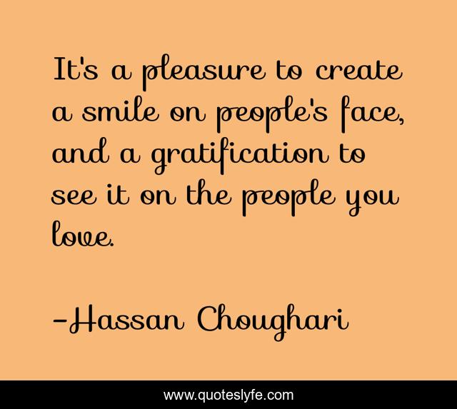 This page presents the quote "It's a pleasure to create a smile on people's face, and a gratification to see it on the people you love.". Author of this quote is Hassan Choughari. This quote is about life, love, relationship, humor, affection, inspirational, smile, enthusiasm, happiness,.