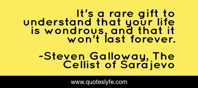 This page presents the quote "It's a rare gift to understand that your life is wondrous, and that it won't last forever.". Author of this quote is Steven Galloway, The Cellist of Sarajevo. This quote is about forever, knowledge, life, wisdom, epiphany, inspirational, enthusiasm,.