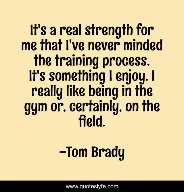 This page presents the quote "It's a real strength for me that I've never minded the training process. It's something I enjoy. I really like being in the gym or, certainly, on the field.". Author of this quote is Tom Brady. This quote is about me, enjoy, training,.