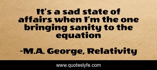 This page presents the quote "It’s a sad state of affairs when I’m the one bringing sanity to the equation". Author of this quote is M.A. George, Relativity. This quote is about sanity, equation, humor, paranormal-romance, sarcastic-humor,.