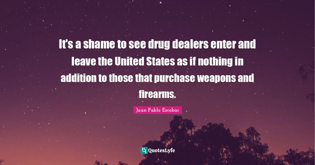 This page presents the quote "It's a shame to see drug dealers enter and leave the United States as if nothing in addition to those that purchase weapons and firearms.". Author of this quote is Juan Pablo Escobar. This quote is about drug dealers, united states, weapons, firearms, shame, drug,.
