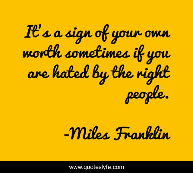 This page presents the quote "It's a sign of your own worth sometimes if you are hated by the right people.". Author of this quote is Miles Franklin. .