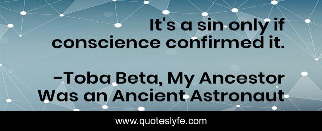 This page presents the quote "It's a sin only if conscience confirmed it.". Author of this quote is Toba Beta, My Ancestor Was an Ancient Astronaut. This quote is about conscience, sin,.