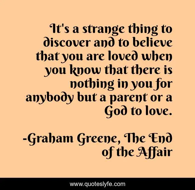 This page presents the quote "It's a strange thing to discover and to believe that you are loved when you know that there is nothing in you for anybody but a parent or a God to love.". Author of this quote is Graham Greene, The End of the Affair. This quote is about being-loved, love, affection,.