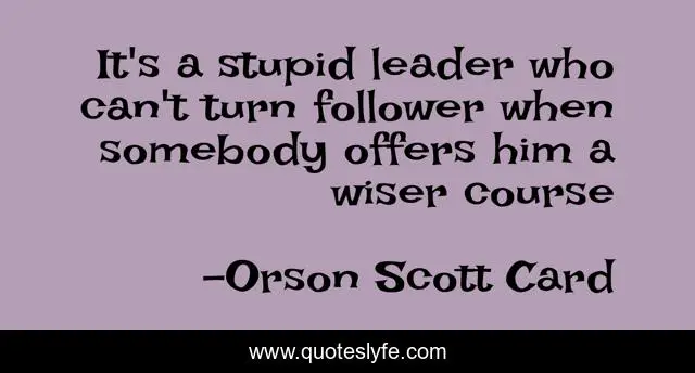 This page presents the quote "It's a stupid leader who can't turn follower when somebody offers him a wiser course". Author of this quote is Orson Scott Card. This quote is about follower, wise, leader,.